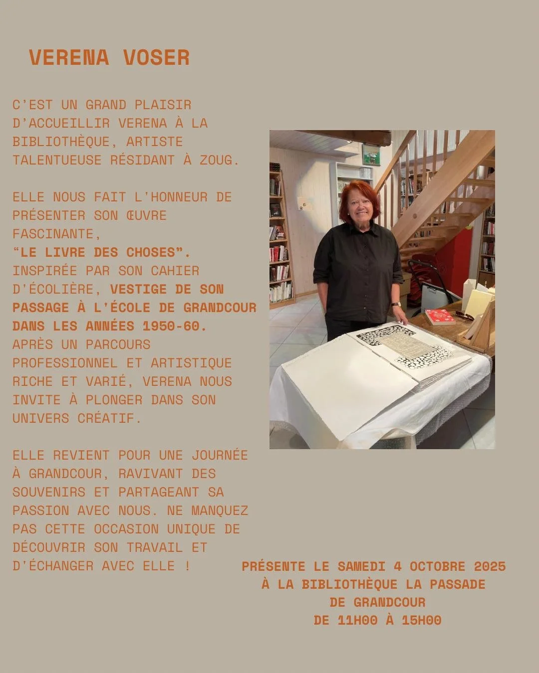 Nov. 14 bis 23. Nov. ricordi Fr., 14. Nov. 2025 18:00 So., 23. Nov. 2025 17:00 st. martinskeller, adligenswil (Karte) Google Kalender ICS Veranstaltung ansehen → Okt. 4 bibliothèque grandcour Samstag, 4. Oktober 2025 11:00 15:00 bibliothèque «la passade», grandcour (Karte) Google Kalender ICS Veranstaltung ansehen → kontakt | datenschutz© verena voser 2025